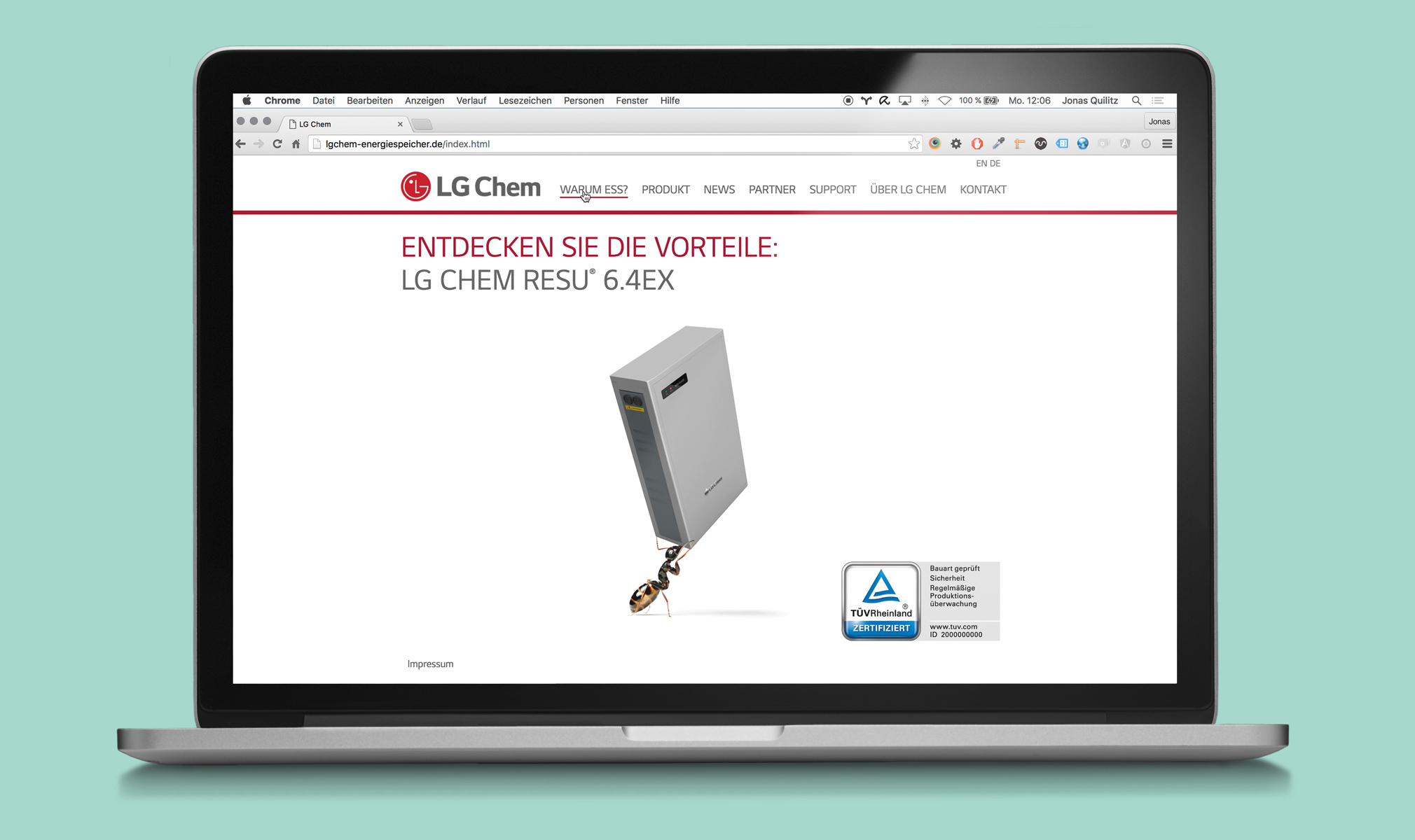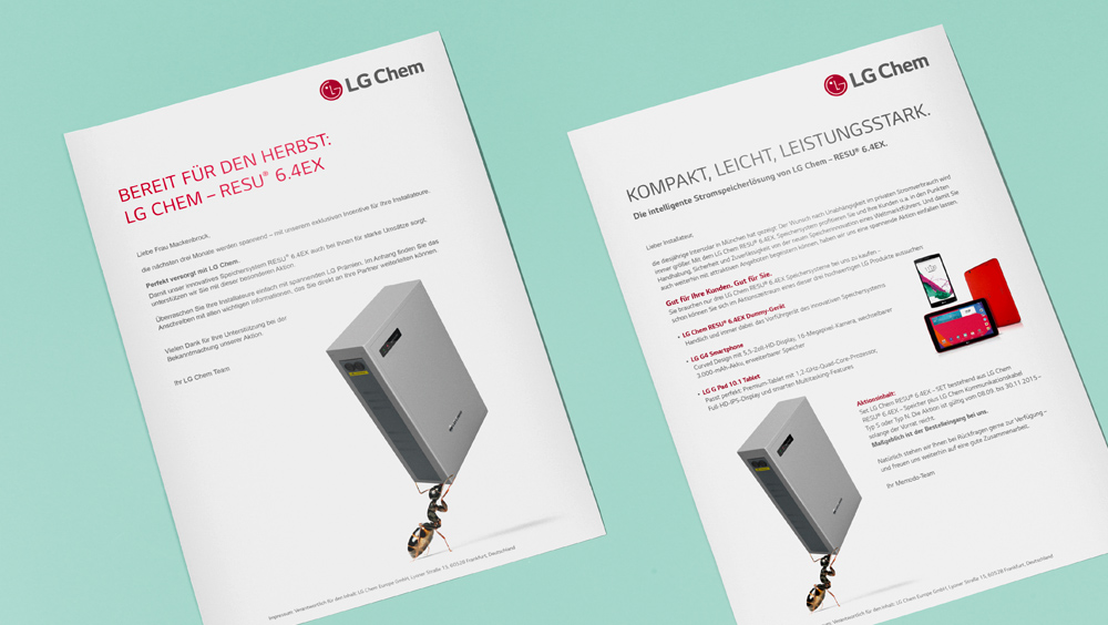 Um das RESU® 6.4EX bekannter zu machen, starteten wir ein exklusives Incentive für die Installateure. Als ersten Schritt versendete LG Chem dazu ein Anschreiben an die Distributeure mit der Bitte, alle Informationen zur Produkteinführung an ihre Partner weiterzuleiten. An die Verbraucher wurde natürlich gedacht: mit hochwertigen und informativen Cross-Flyern, die die Installateure direkt an interessierte Kunden aushändigen konnten.