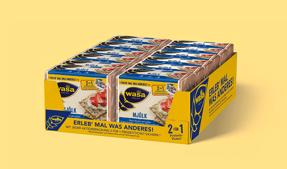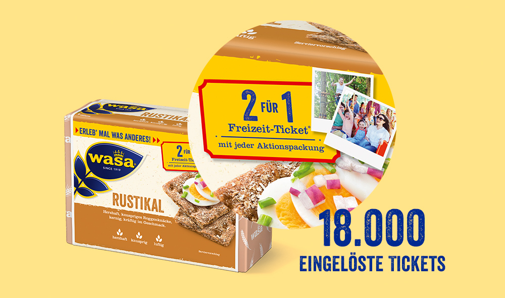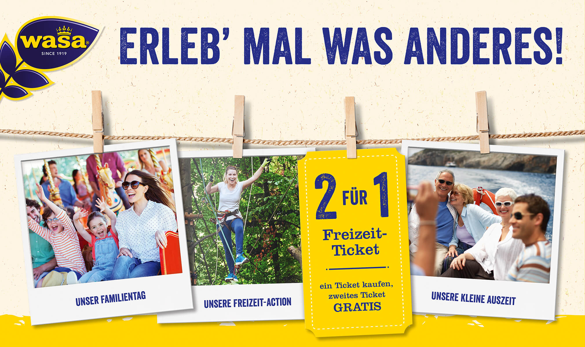 Auf jeder Aktionspackung Wasa Knäckebrot ist ab Neujahr 2017 ein 2 für 1 Freizeit-Ticket auf der Rückseite aufgedruckt. Dieses Ticket reduziert den Eintrittspreis für zwei Personen bei über 180 Freizeitpartnern einfach um die Hälfte – für Schwimmbad, Zoo, Freizeitpark, Schifffahrt, Museum oder Klettergarten – und das in ganz Deutschland und Österreich.